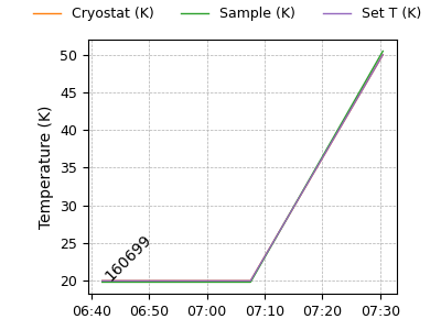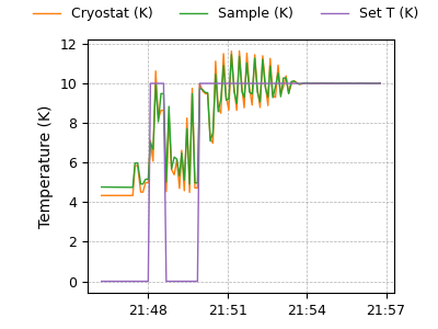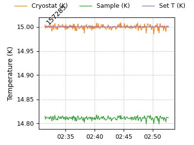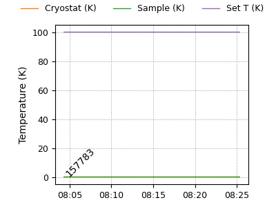| Cryostat (K) | Sample (K) | Set T (K) | HTR Pwr (%) | LCPS (G) | wLF (G) | TCPS (G) | MF (SLM) |